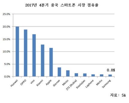 韓国メディアは、昨年第4四半期のサムスン電子の中国でのスマートフォン市場シェア率が0.8%に急落したと報じました。
