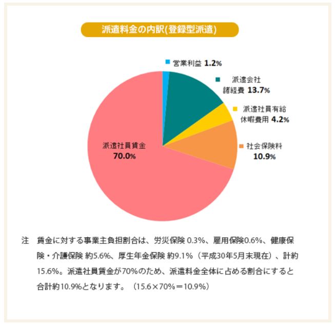 2名無し2019/04/23(Tue) 01:44:58ID:Q0Nzg1MTY(1/3)NG報告調べてみた。日本の派遣会社の受け取るマージンは だいたい25~30%。だから 韓国とあまり変わらない。だけど マージン中には派遣会社の社会保険料、有給休暇の費用、スキルアップのための教育訓練費などが含まれる。図は「派遣料金の内訳」派遣社員の賃金が70%社会保険料 10・9%有給休暇費用 4.2%派遣会社諸経費 13.7%営業利益 1.2%この内訳をみる限り 派遣会社が不当に儲けているとはとても言えない。むしろ営業利益率が低い業界といえるだろう。>>3>>17>>301