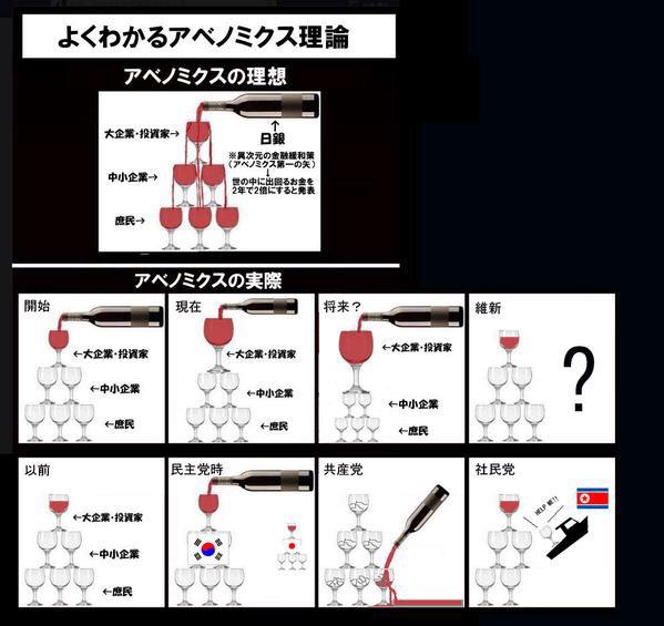 アベノミクスに批判的な勢力が、1、2、3の図を並べる事で、トリクルダウンなど起こらず、大企業だけが潤うのだと皮肉った。