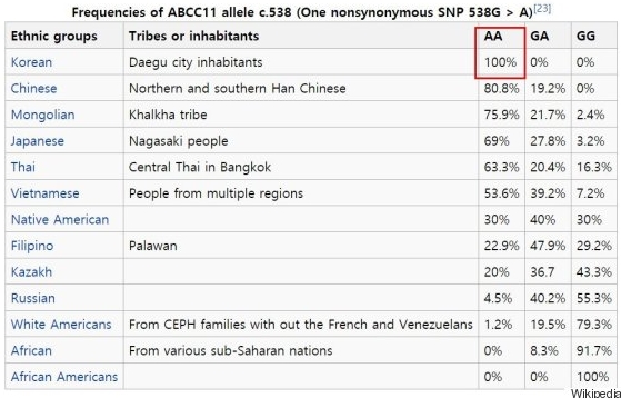 AA 형질은 냄새가 없다. 이 형질을 한국인은 100% 보유하고 있다.