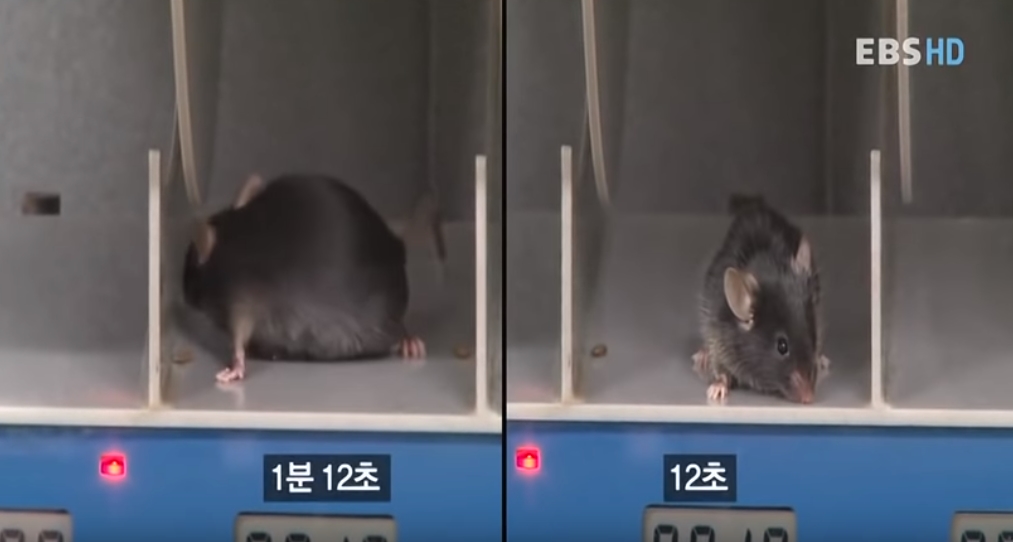 (아래 실험은 무한회전하는 원통위에 실험쥐를 배치하고, 달리기 체력시험으로 낙하까지의 시간을 측정한다.)