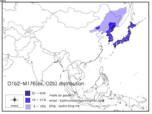 「O1b2系統は、オーストロアジア語族の民族に高頻度にみられるO1b1系統の姉妹系統であり、満州や朝鮮半島などの東アジア北東部に多く分布する。」