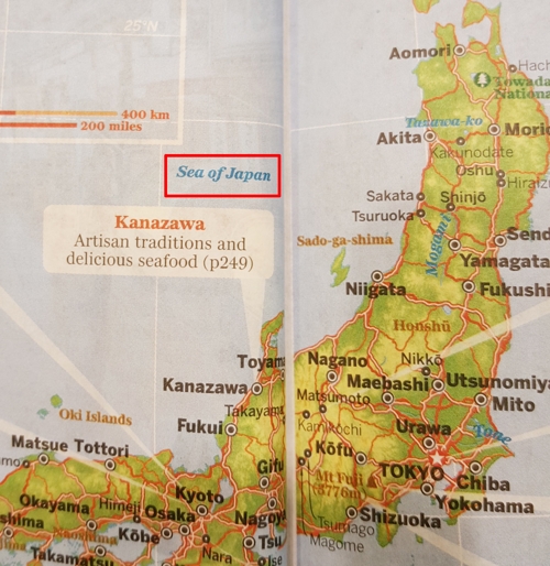 ロンニプラネット韓国旅行では、東海と日本海が一緒に書かれているが、日本旅行では、東海を日本海のみ表記している。