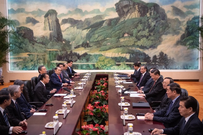 習主席はこの日、日本首相の特使を向かい合って座った。中国国営の新華社通信など中国メディアの25日の報道によると、習主席が二階幹事長と対等な位置で向かい合って座る写真が掲載されている。あたかも両国首脳が会って拡大首脳会議をしているような場面だ。これを受け、中国が最近、日本との関係を改善し、両国が過去より密着しているという解釈が出ている。