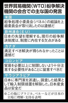 韓国による福島など8県産水産物の輸入禁止措置を事実上認めた世界貿易機関(WTO)上級委員会の判断を問題視する日本に対し、4月の紛争解決機関(DSB)会合で理解や支持を表明した国々の主な発言内容が15日、判明した。発言した国の大半にあたる10以上の国や機関が日本側に理解を示し、米国は上級委の判断を「遺憾」とし、欧州連合(EU)は現行の紛争解決制度は「内在する欠点がある」と断じた。政府関係者が明らかにした。