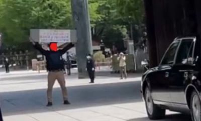 靖国神社によると、立ち入り規制中だった参道で、儀式を終えた天皇陛下の勅使が乗る車を含む車列の前に、容疑者が立ちはだかり、横幕を掲げたという。