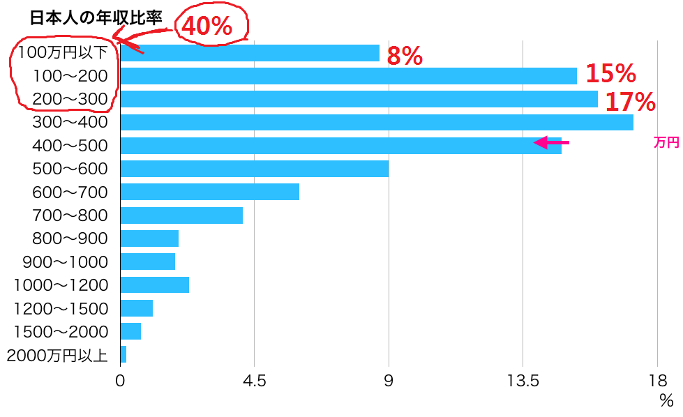 日本人の40%以上の人が300万円以下の年収になっていますw