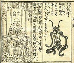 これは角大師と呼ばれる魔除けの護符で主に天台宗と呼ばれる仏教宗派で檀家の入り口や門に貼り付けます。この宗派の総本山である比叡山延暦寺の最高位、天台座主だった昔の高層をモデルにしたと云われており、これを