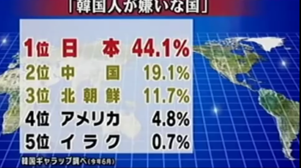 44.1%日本が1位、△中国19.1% △北朝鮮11.7% △米国4.8%。