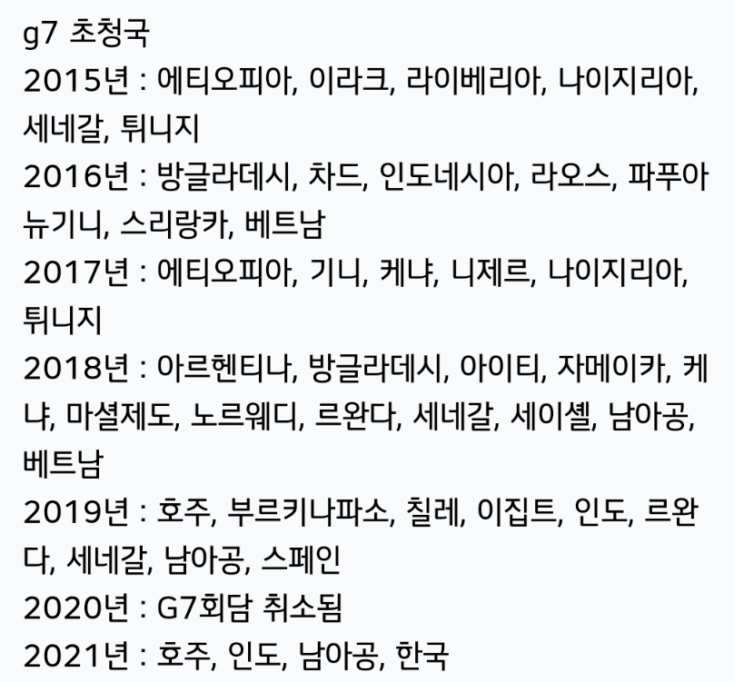 1975년 주요 6개국 정상회의로 시작한 ‘G7’은 2007년 금융위기가 터지자 아시아와 아프리카 나라 등을 초청해 확대정상회의를 연 바 있다. 도널드 트럼프 전 미국 대통령 때는 러시아를 포함한 ‘G11’ 구상안이 나오기도 했지만 실현되지 못한 바 있다. 이번 회의에 한국·호주 등이 초청되면서 다시 정상회의 확대안이 주목받기도 했지만 회원국인 일본 등의 반대가 있었던 것으로 알려져 있다.
