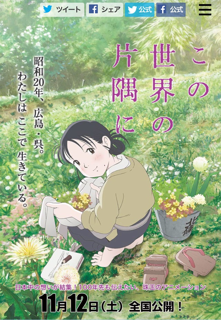 1日本生日本育2016/11/13(Sun) 16:38:23ID:A5Mjg0ODQ(1/5)NG報告今月から上映された「この世界の片隅に」の感想や感じた事、思った事を書き込むスレです。戦争歴史アニメーションとでも言いましょうか、個人的にはぜひ見て欲しい映画です。>>184