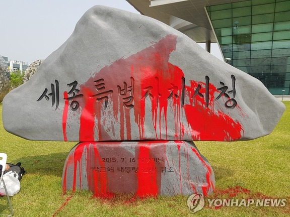 朴槿惠前大統領が書いた世宗市庁の石碑がペンキを被った。