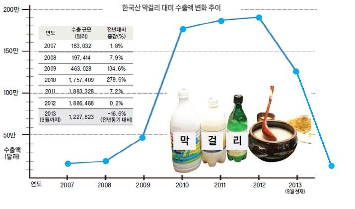グラフは輸出だけど、マッコリ、キムチ共に韓国国内市場も大幅に縮小してる模様>>14