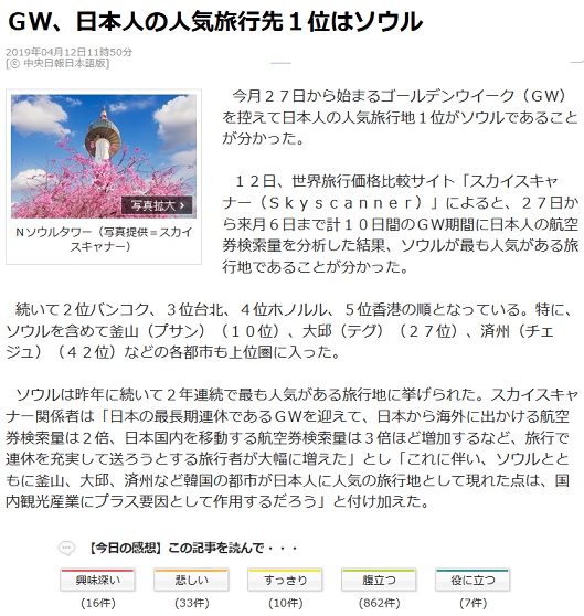 http://www.chosunonline.com/site/data/html_dir/2019/05/06/2019050680006.html韓国に行くんであれば、旅費が2~3倍かかっても北海道や沖縄に旅行した方が良い思い出が残る。