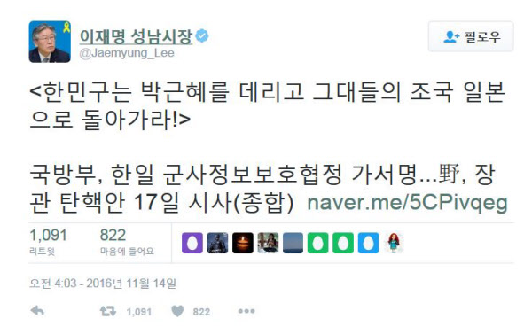 李市長は「韓民求は朴槿恵(パク・クンヘ)を連れて、お前たちの祖国日本へ帰れ」と、短いが断固とした一文を書き込み、韓長官が韓日GSOMIAを強行したのは韓国国民の意向に反する行動だと非難した。