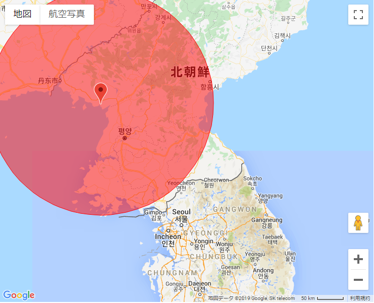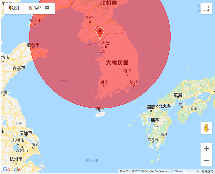 その円で東方向だと北朝鮮沿岸すぎるし円を拡大するとすぐ日本EEZになる