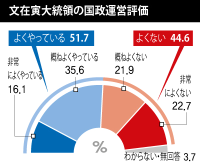 あなた達が選んだ大統領でしょう?>>14 保守派は、左派の調査なので、反文在寅を10%上積みしなければならないと言っているが。