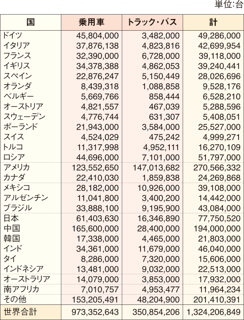 当然のことながら、その国の自動車保有台数は国民の購買力(≒一人当たりGDP)に比例するので、日米欧など先進国が多く、中国・韓国など新興国や発展途上国では少なくなると思うが。