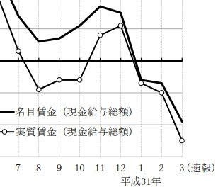 厚生労働省が10日発表した3月の毎月勤労統計調査(速報、従業員5人以上)によると、物価変動の影響を除いた実質賃金は前年同月比2.5%減少した。2015年6月以来3年9カ月ぶりの低下幅となる。相対的に賃金が低いパートタイム労働者の比率が増加したことが減少につながった。