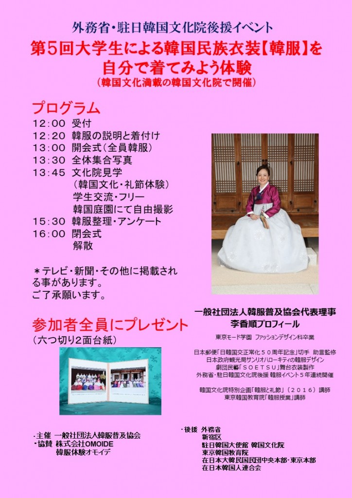 【ソウル聯合ニュース】日本で韓国の伝統衣装・韓服の普及に努めてきた社団法人韓服普及協会が29日に「第5回大学生による韓国民族衣装【韓服】を自分で着てみよう体験」を東京・韓国文化院で開催する。