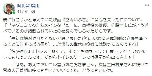 映画『空母いぶき』百田尚樹氏「下痢する弱い首相にしてくれという一役者の要求に、観ないと決めた」