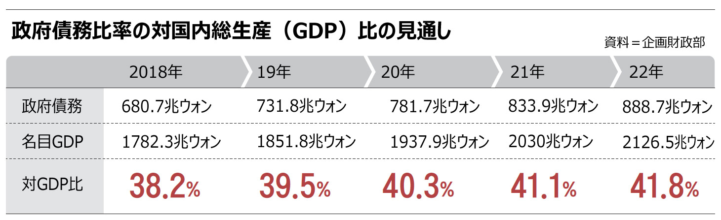 しかし、文在寅(ムン・ジェイン)大統領は16日、国家財政戦略会議で財政拡大を強調したことから、政府債務比率は来年には40%を超える見通しだ。財政当局である企画財政部は2020年に政府債務比率が40.3%に上昇し、21年には41.1%、22年には41.8%に達すると予測した。
