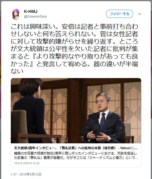 このネチズンはムン・ジェイン政府2年特集対談「大統領に尋ねる」で浮上した「失礼記者」の議論を扱ったヤフージャパンの記事をTwitterに上げドア大統領の言動に感心した。