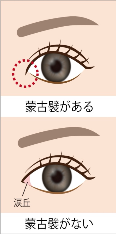 新モンゴロイドは、瞼に内眼角贅皮(蒙古襞)があって涙丘が露出していない。
