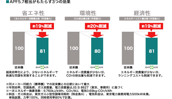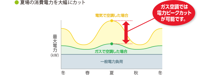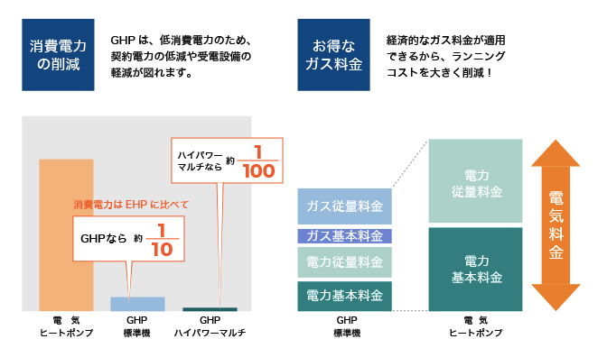 「GHP(ガスヒーポン)」とは、「ガスエンジン・ヒートポンプ・エアコン」の略。 室外機のコンプレッサーをガスエンジンで駆動し、ヒートポンプによって冷暖房を行う空調システムです。 GHPの暖房では、エンジンを動かすために使用したガスの廃熱も利用するため、霜取り運転をする必要がなく、電気式よりもパワフルでスピーディーな暖房を実現します。 消費電力が電気のヒートポンプに比べて約10分の1になることから、契約電力に大きな余裕が生まれ、割引ガス料金制度もあるため、ランニングコストを大幅に節約できます。 省エネ・省コストで年間を通じて快適な空間を創造します。