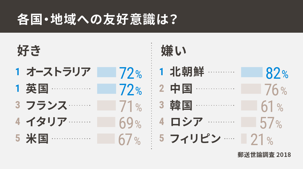 日本人は北朝鮮、中国、韓国、さらにロシアが嫌い
