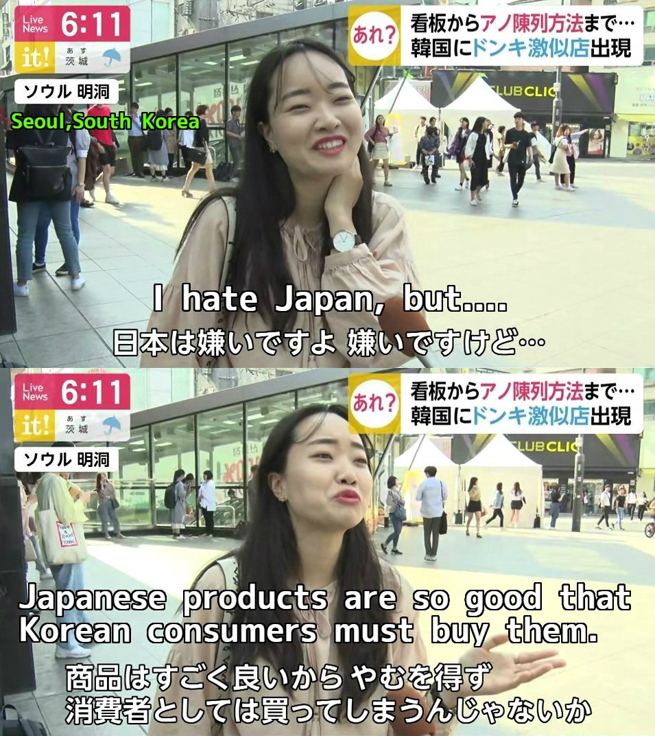 日本の有形無形の支援に甘えて調子にのった事を後悔させる時がやっと来ましたね。>>18 商品整理ができない店など、どこの国にもある。今回は「日本に行かずにドンキに行ける」がコンセプトだろ?Tシャツに書いてあるじゃん。まるっきりモノマネだよ。恥ずかしくないのか?