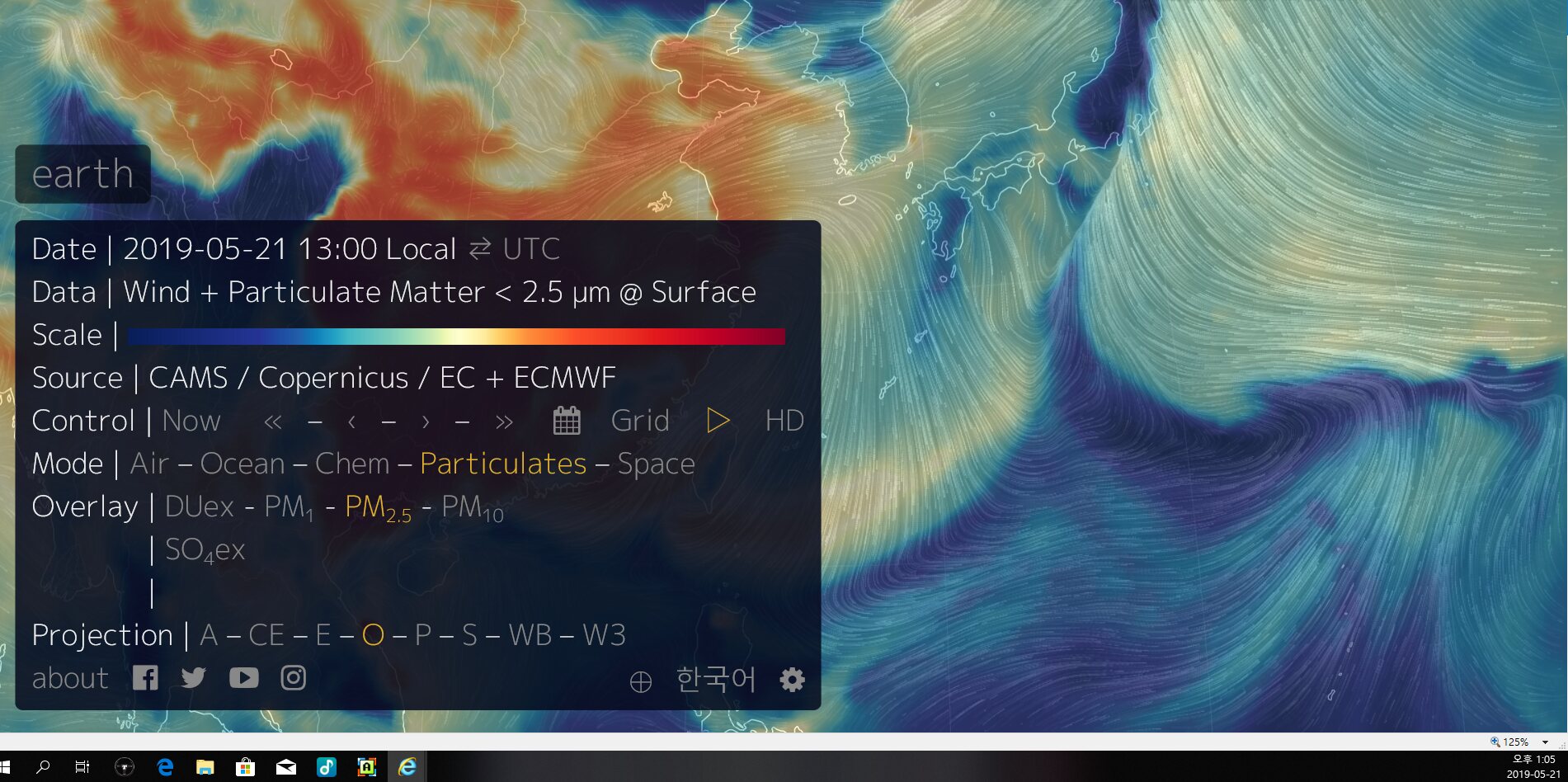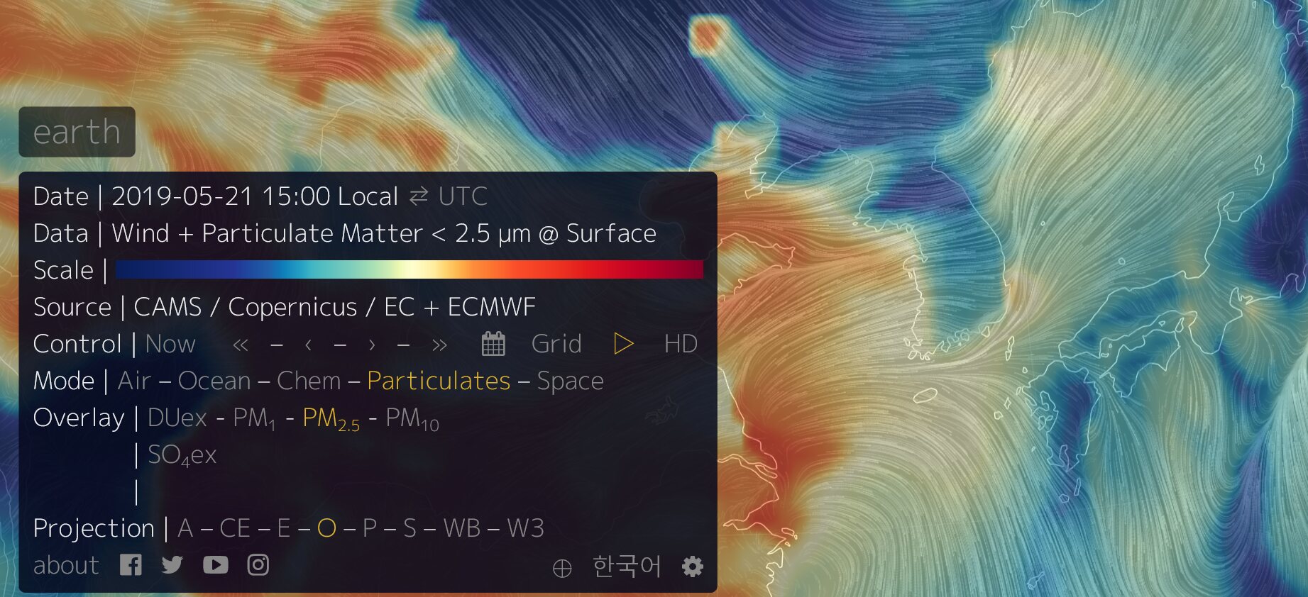 https://earth.nullschool.net/#current/particulates/surface/level/overlay=pm2.5/orthographic=-279.08,36.19,1137/loc=126.361,37.873