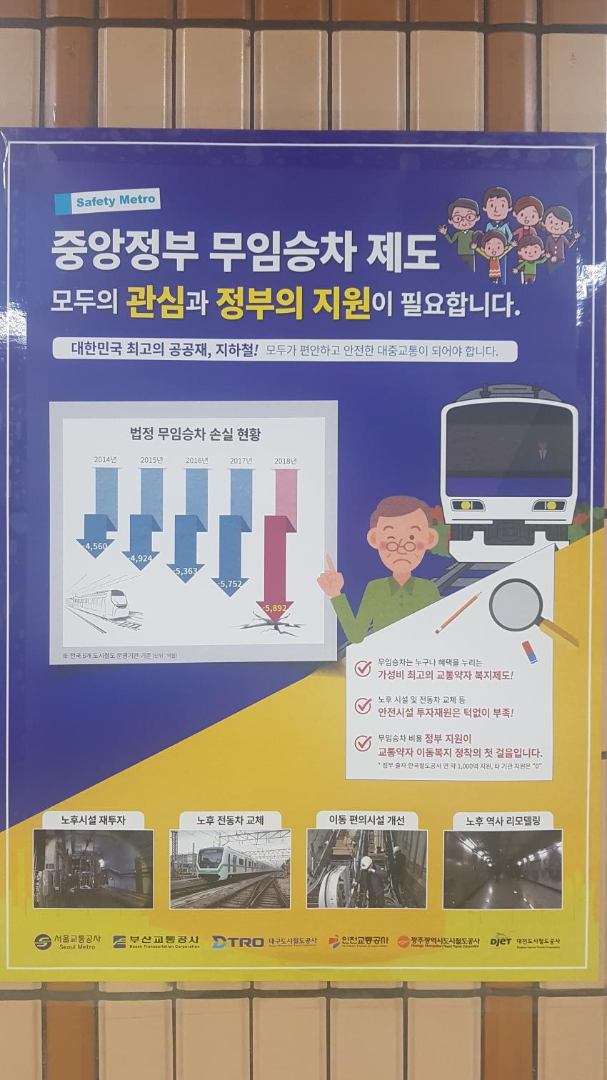 '무임승차 제도'.....이것은 한국의 제도이다. 65세 이상 노인의 경우 지하철도를 무료이용이 가능하다.