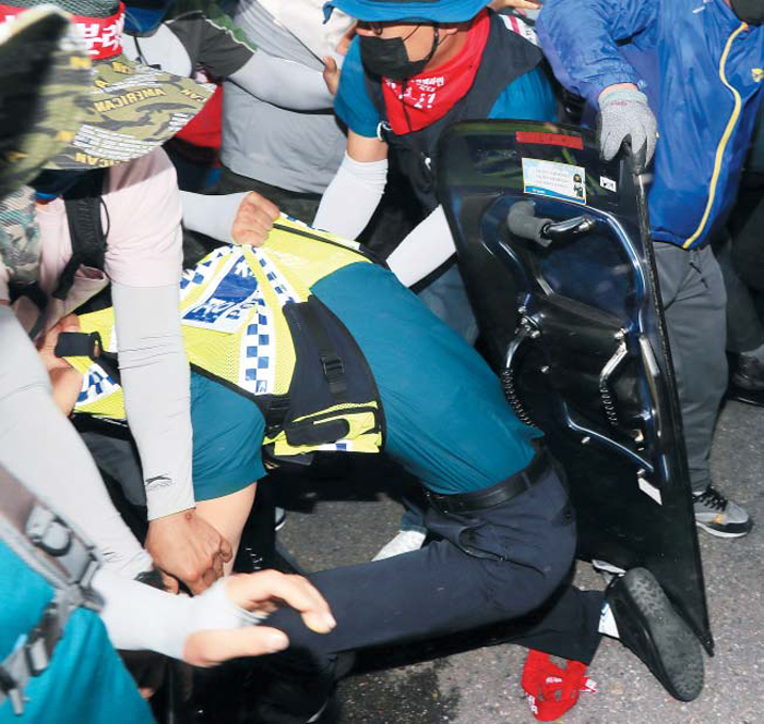 民主労総組合員が集会の過程で警察官の胸ぐらをつかんで押すなど暴力を行使した。10人を超える警察官が歯折れて手首を骨折するなどの負傷した。