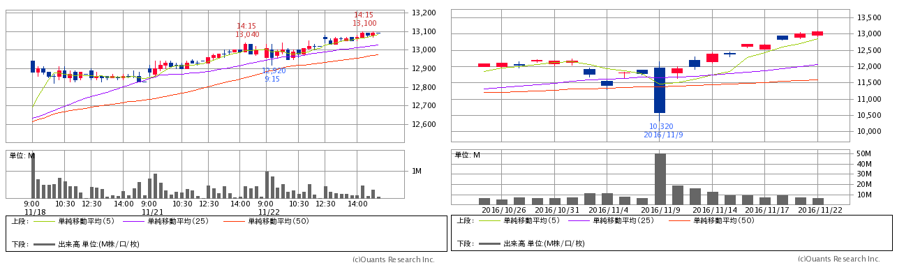 画像は私が3日前に買ったETFのチャートで、左が3日分の15分足で、右が1か月分の日足です。
