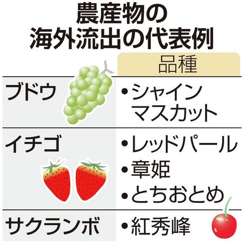 例えば、日本で開発されたブドウの一種で、皮ごと食べられるシャインマスカットは苗木が持ち出され、中国や韓国で栽培されて一部は東南アジアに輸出されている。