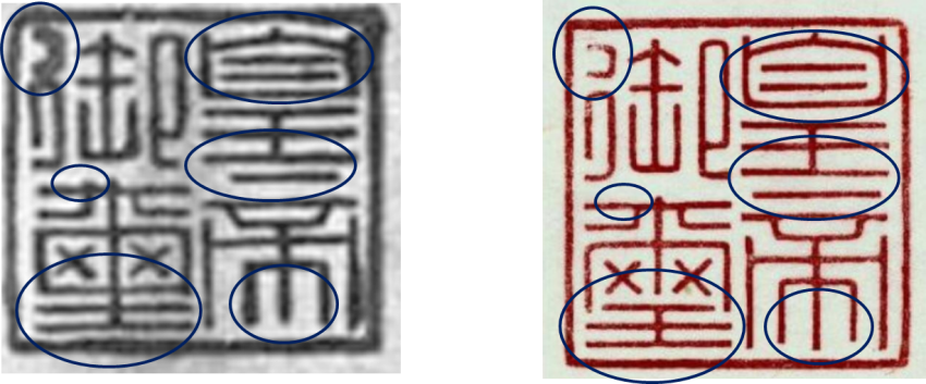 차이가 엄청나게 많이 나지요. 딱 눈으로 보이는 것만 해도 저 정도고 대칭이나 비율까지 고려하면 완전히 다른 직인이라는 걸 알 수 있고요.