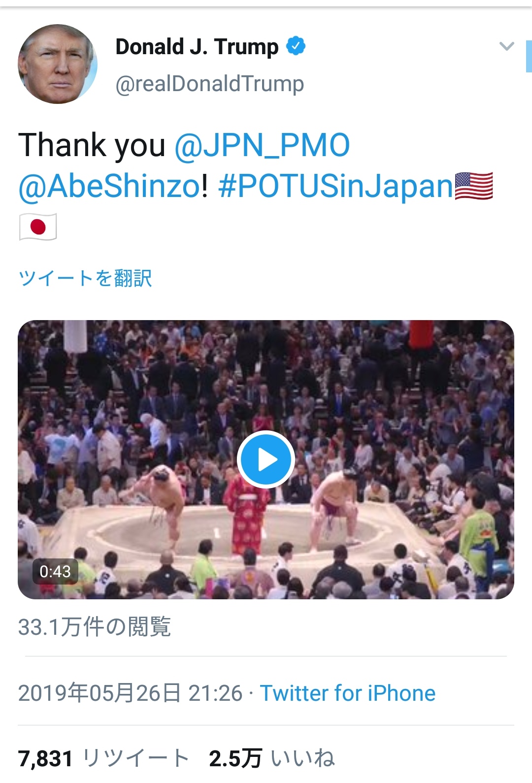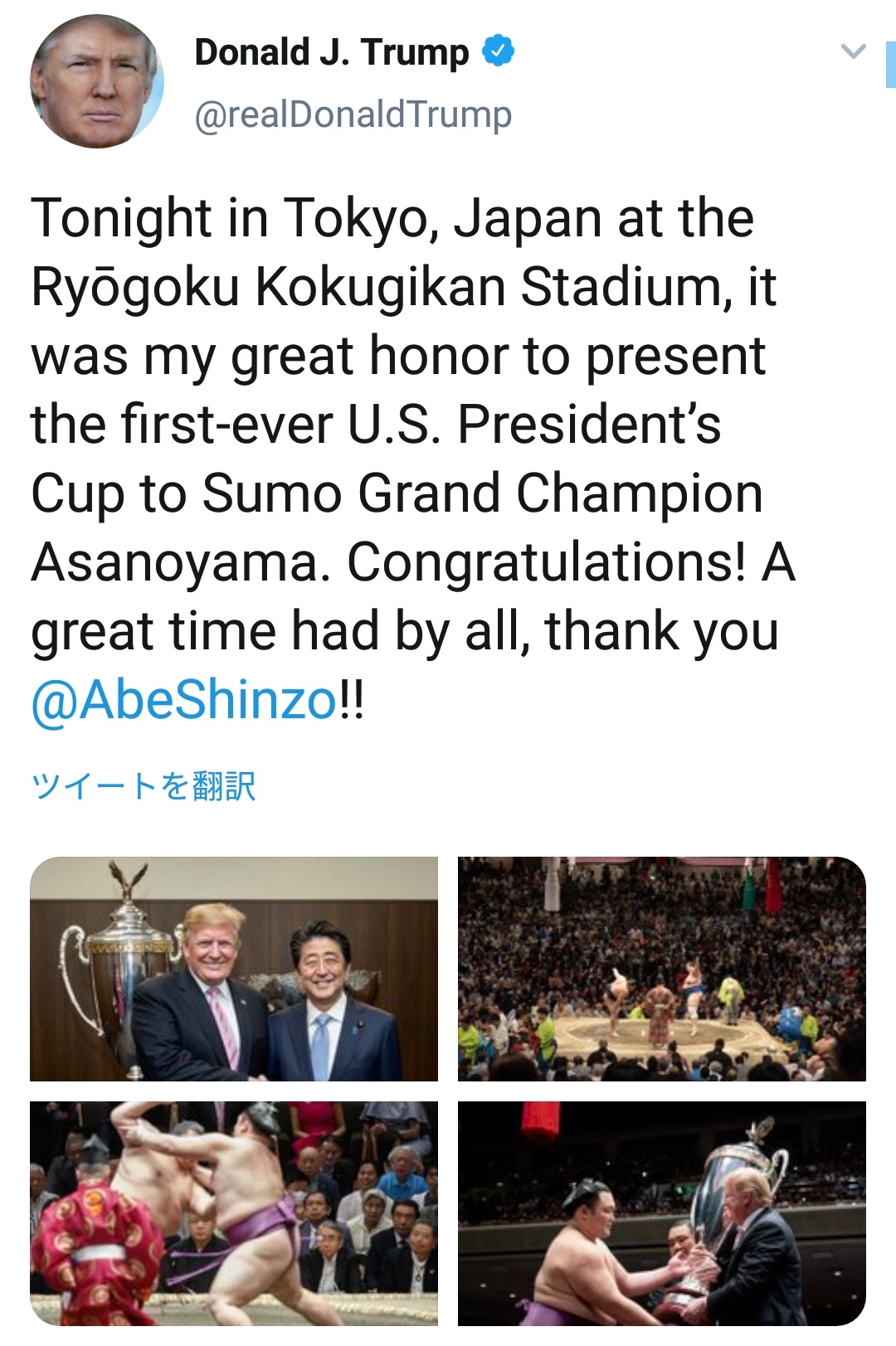 現職米大統領の大相撲観戦は初めて。トランプ氏はこの日、午後8時48分にツイッターを更新。「すばらしい時間」と投稿した。