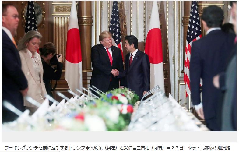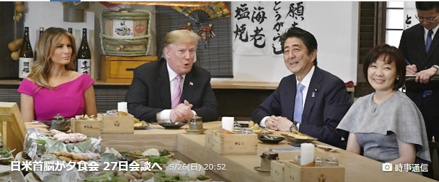 安倍晋三首相と来日中のトランプ米大統領は26日夜、東京・六本木の炉端料理店で夕食を共にした。夕食会冒頭、首相は記者団に「令和時代の初めての国賓として、トランプ氏とメラニア夫人に来日していただき、大変うれしく思う」と述べた。