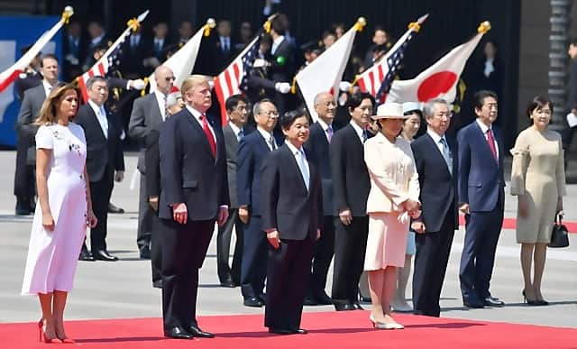 国賓として来日したトランプ米大統領夫妻の歓迎行事が27日午前、皇居・宮殿東庭(とうてい)であった。代替わり後、天皇、皇后両陛下が国賓を迎えたのは初めて。