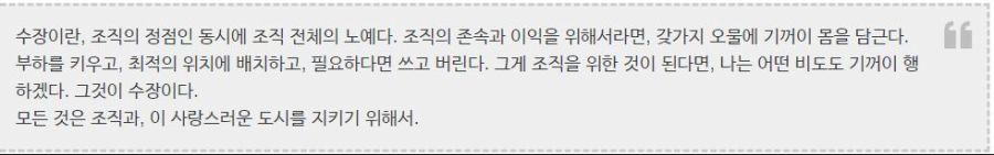>「収蔵とは、組織の頂点であると同時に、組織全体の奴隷だ。組織の存続と利益のためなら、様々な汚物に喜んで身を浸す。負荷を育て、最適の位置に配置し、必要であれば書いてしまう。それ組織のためのものであれば、どのような雨にも喜んで行なう。それ首長である。 」