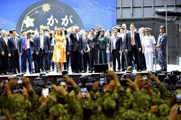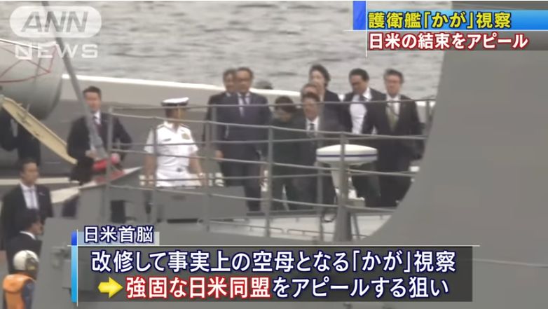 トランプ米大統領は28日午前、安倍晋三首相と海上自衛隊の横須賀基地(神奈川県横須賀市)を訪れ、護衛艦「かが」を視察した。「かが」は事実上の空母化が決まっており、日本政府が購入する米国製のステルス戦闘機F35Bの搭載が可能となる。日米首脳がそろって乗艦し、強固な同盟関係をアピールした。トランプ氏はその後、米兵を前に「力による平和が必要だ」と演説し、日米連携の重要性を訴えた。