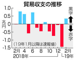 대중국 수출은 전년보다 6.3% 줄어들어 2개월 연속 감소했다. 반도체 등 전자부품은 21.5%, 반도체 제조장비가 41.0% 각각 급감했다. 금속가공 기계와 자동차 부품 등도 눈에 띄는 감소세를 보였다. 식료품 수출도 8.2% 줄어 아베 신조 정권이 내건 ‘식품 수출 1조 엔’ 목표 달성에 제동이 걸렸다.