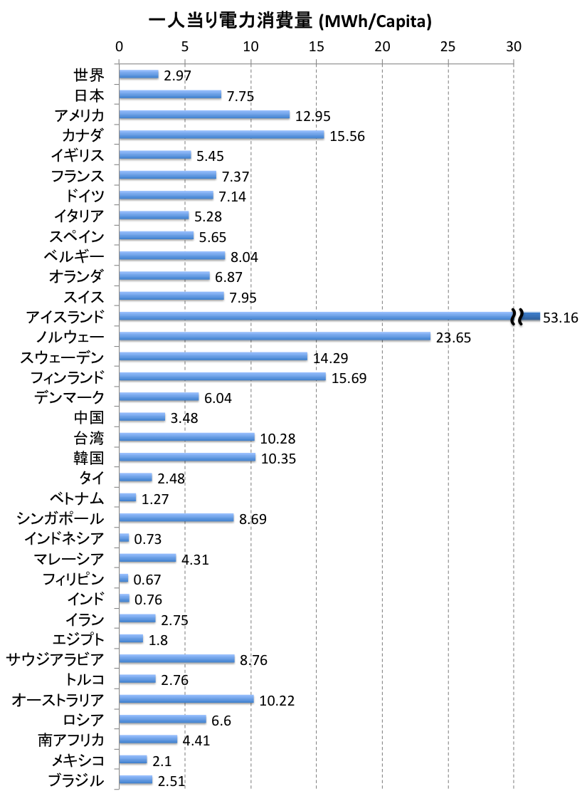 疑問.1)なんで韓国は、平均気温の高い日本より一人当たりの電気消費量が高いのであろう?
