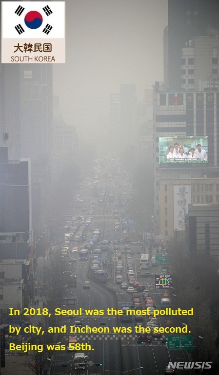 3月5日、世界的な大気汚染調査機関「エアビジュアル」(AirVisual)の都市別空気質指数(AQI=アメリカ環境保護庁(EPA) が大気の汚染状態を.PM2.5などさまざまな大気汚染の数値を評価する指数)によると、同日午後5時現在の大気汚染度世界1.2位はソウル市(188)と仁川市(180)でした。