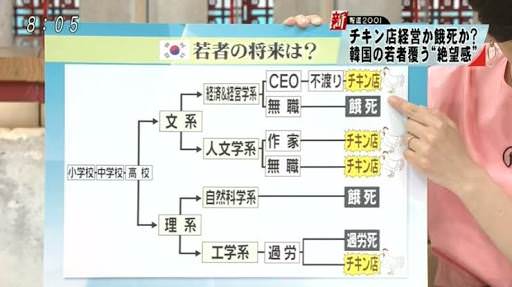 なぜこんなに多いのか?報告書はその理由として高い失業率をあげた。2019年4月現在、日本の失業率は2.4%だが、韓国の失業率は4.4%に達する。韓国では仕事をクビになった人の再就職は難しく、自分で飲食店を開業する人が多い。事業経験が無い人はフランチャイズ店と契約してノウハウを教えてもらいながら店を経営するのが一般的だ。チキンは「国民のおやつ」と言われるほど人気が高く、調理も比較的簡単で、出前での売り上げ比率が高いため店舗が狭くても経営が成り立つ事から、多くの失業者がチキンのフランチャイズ店に人生を賭けるのだという。しかし、あまりにも店舗数が多く競争が激しいため、つぶれる店も多い。2015年以降、毎年6000~8000店が新規創業しているが、同時に毎年8000店以上が廃業している。それだけ、夢破れた人が多いのだ。鳥でよかった。