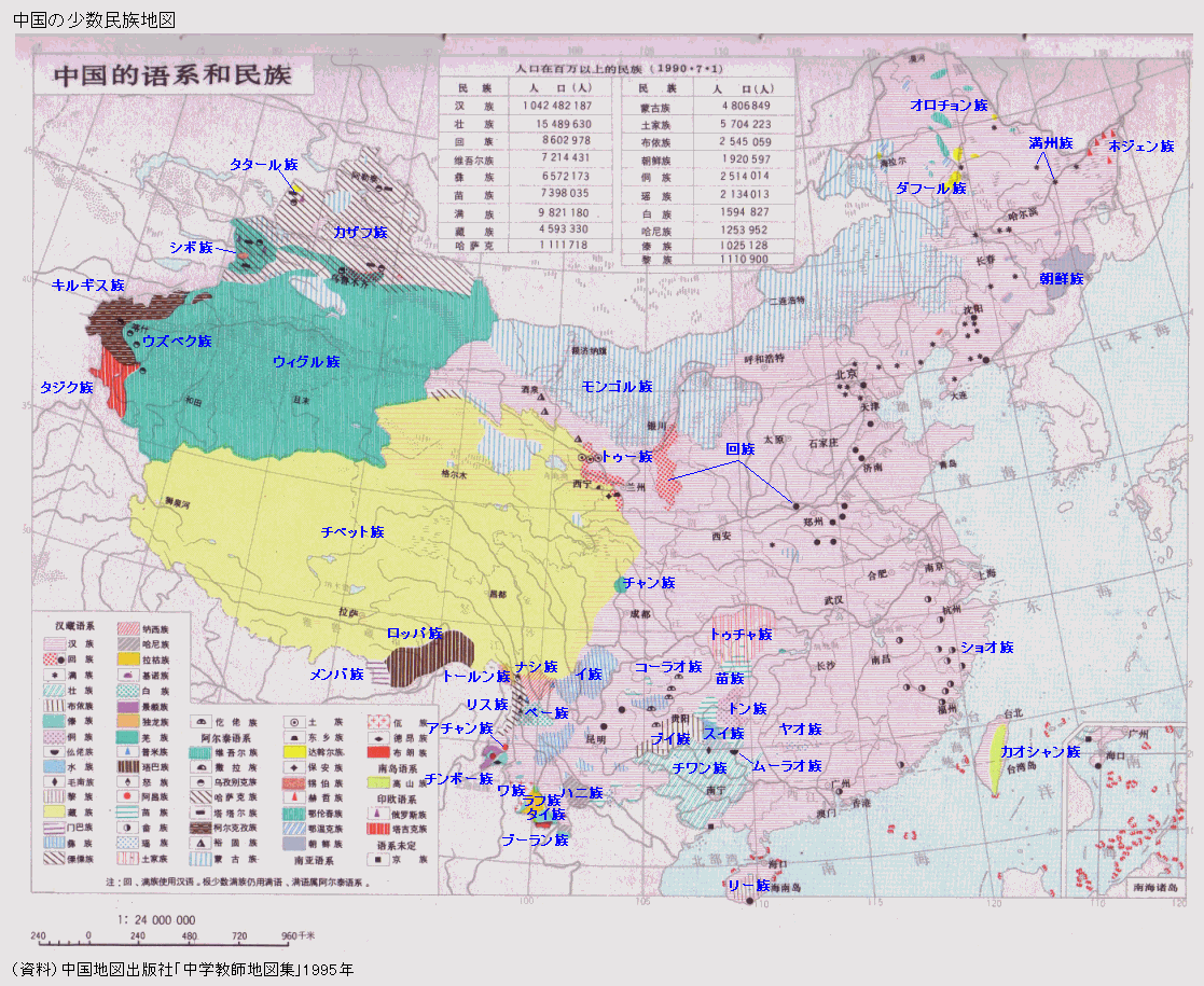 中国の少数民族は政府の公認統計書によると55あるが、チワン族が人口1,600万人と最も多い。次ぎに人口1,000万人前後の満州族と回族が続いている。