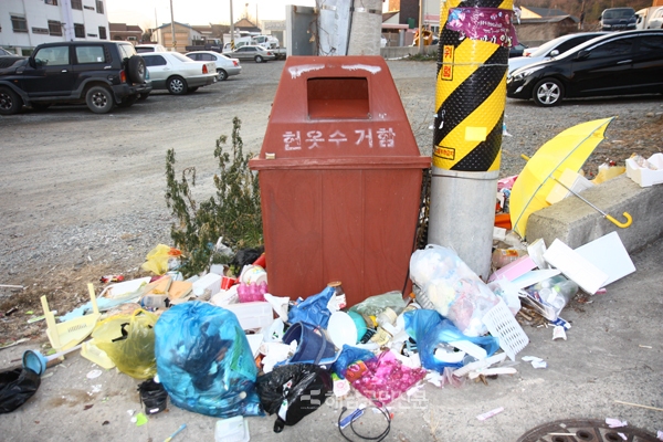 コチュジャンの跡がべたべた残っインスタントご飯容器、たばこの吸い殻や濁り水が入ったペットボトル、トッポッキ汁を入れた袋など「ゴミ」が病気・缶・紙パックなど、通常のリサイクル品よりも圧倒的に多かった。「おむつや動物の死体、生ごみをリサイクルと一緒にした袋に入れて排出する家庭もしばしばある」と訴えた。