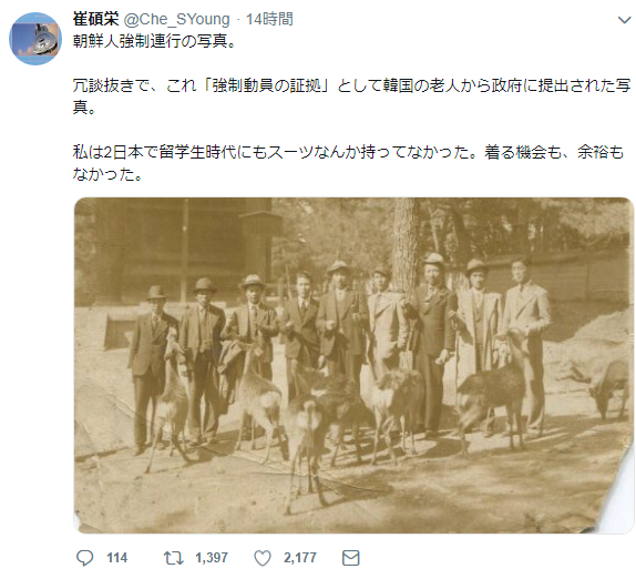 どっかの委員会とかで(日帝の)条約違反や問題の追及を訴えるわけではなく、徴用工に差別的取り扱いがあったのかどうかをシンポジウムで取り上げるというだけの、社会的な反響なんて全くないだろうことが明らかに分かるものだな。スレタイ:「徴用工判決は歴史歪曲」韓国人研究者が国連へ ってあるから判決の違法性でも挙げて今の日韓関係に何らかの国際世論の声を呼び込んで~みたいな話を期待したが、これはダメだな、新聞の一記事にでもなって一時の話題になるくらいで終わる当時はスーツなんて朝鮮人には高値の花だったのだが