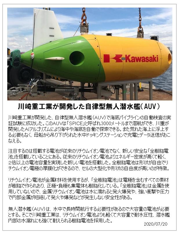 験に成功した。このAUVは「SPICE」と呼ばれ3000メートルまで潜航ができ、川重が開発した
